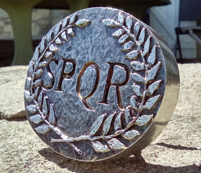 En laiton plaqué argent. Avec la devise de l'ancienne république romaine "Senatus Populus Que Romanus", "le sénat et le peuple romain".